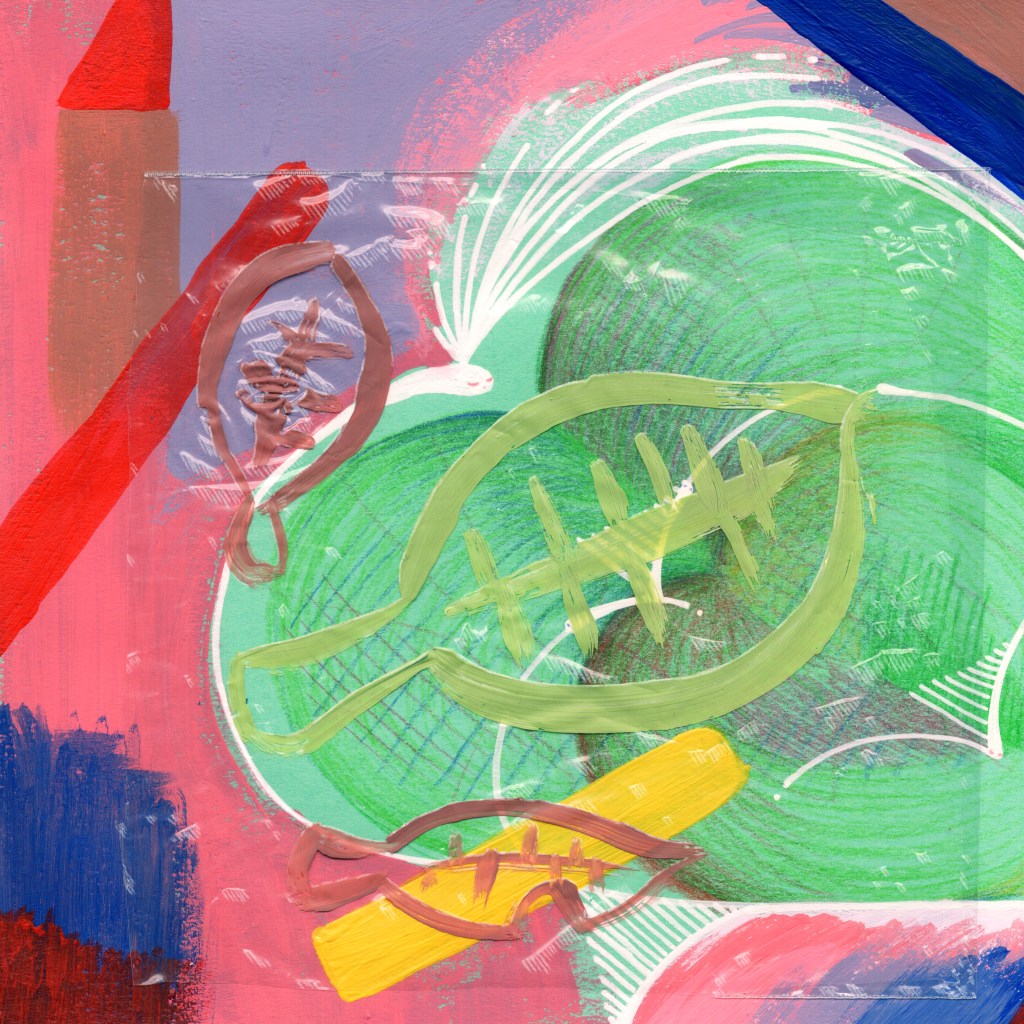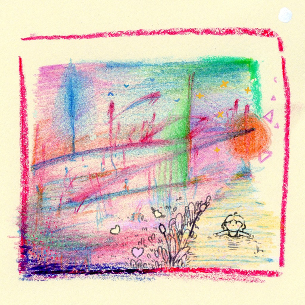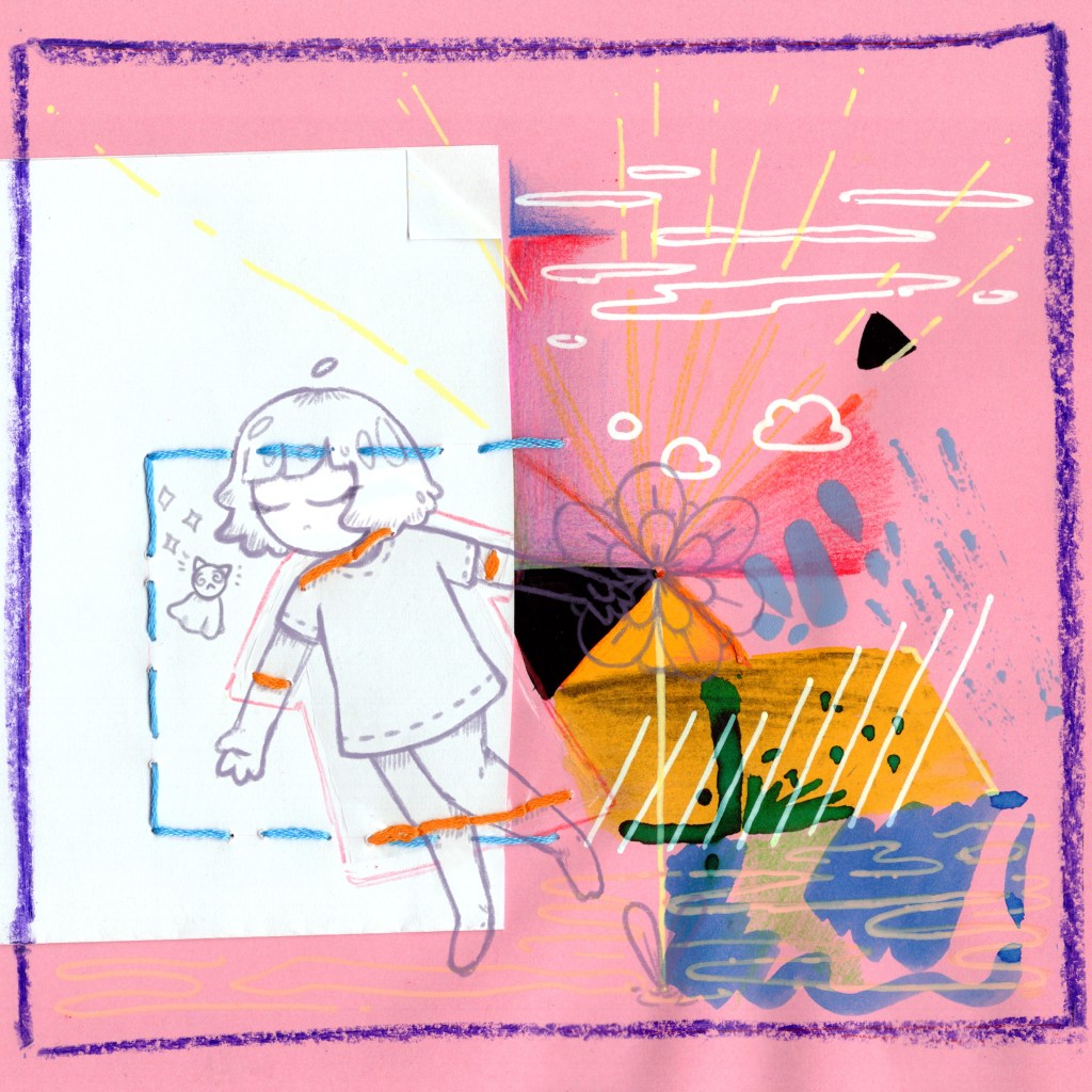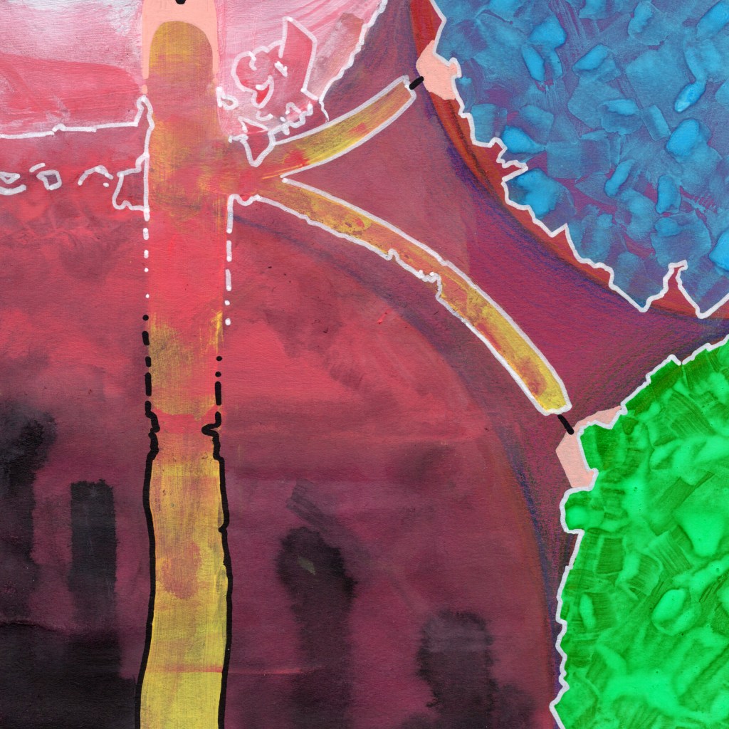 artwork for the individual tracks was made simultaneously to the original demos over the course of 12 weeks in the spring of 2022. all artwork has been made using a combination of traditional media (acrylic, watercolours, wax crayons, coloured pencil, yarn, plastics, nail polish, acetone) and digital media. All artworks use coloured cardstock as a basis.